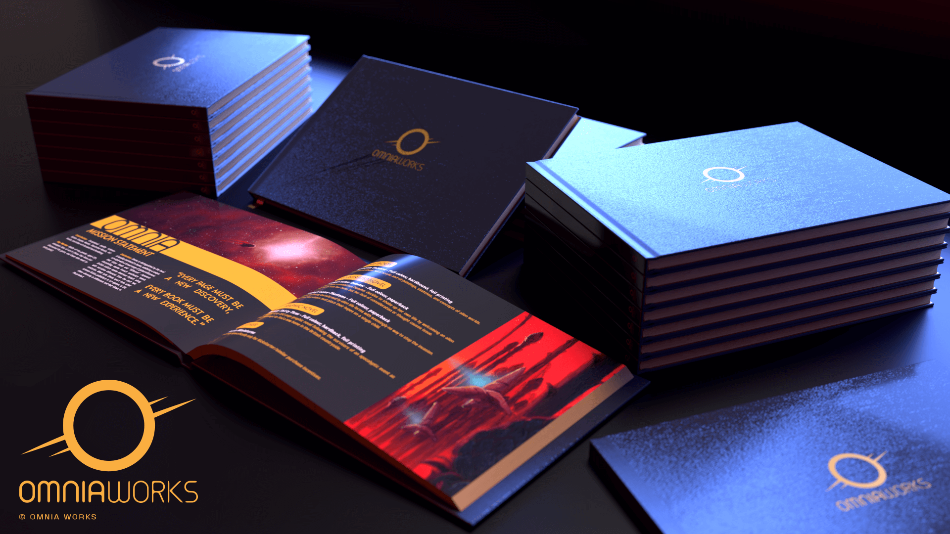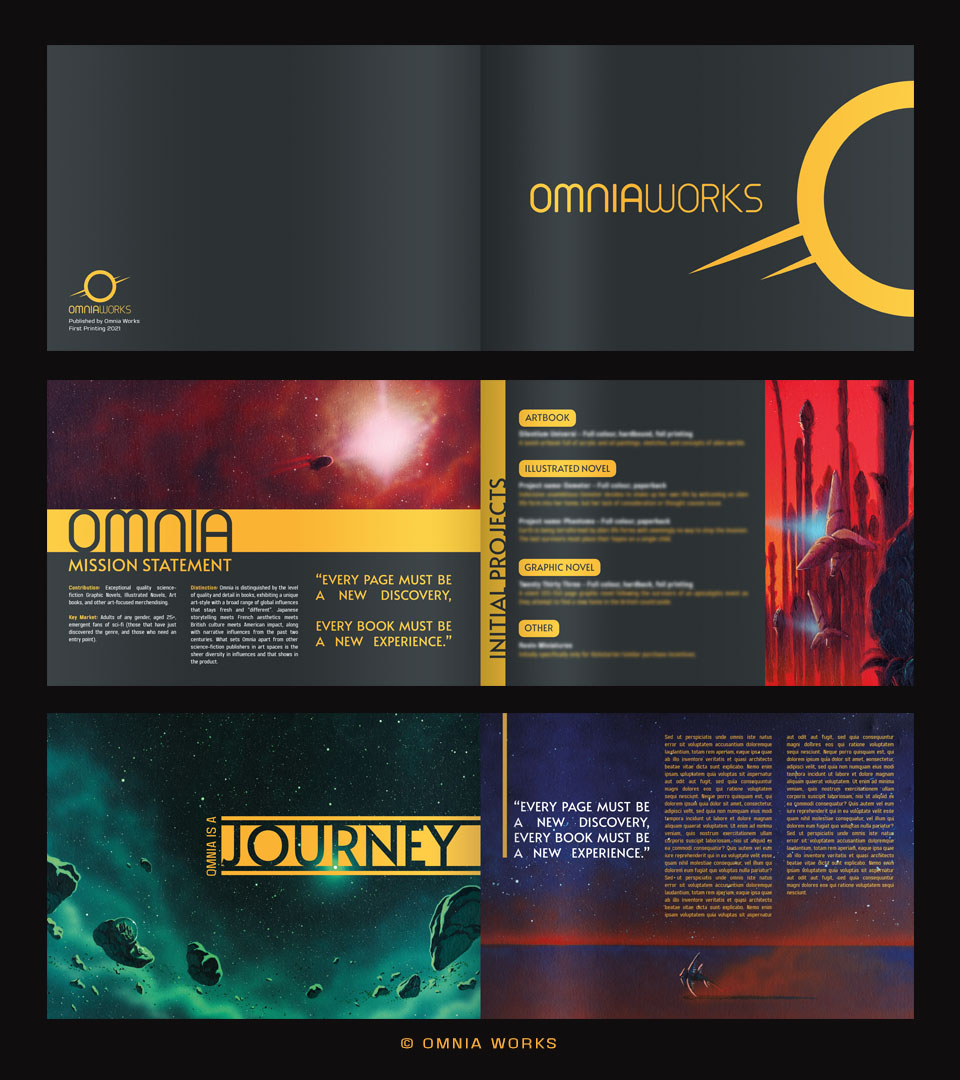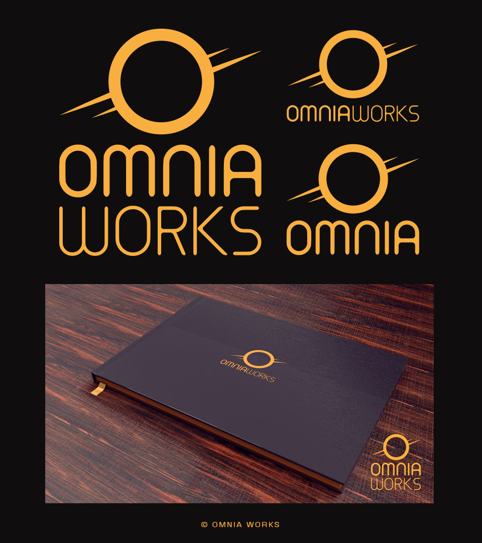 Logo and brand development for Omnia Works, a start-up publisher of art-focused science-fiction works, including laying out an in-house publication establishing a visual direction and style guide.