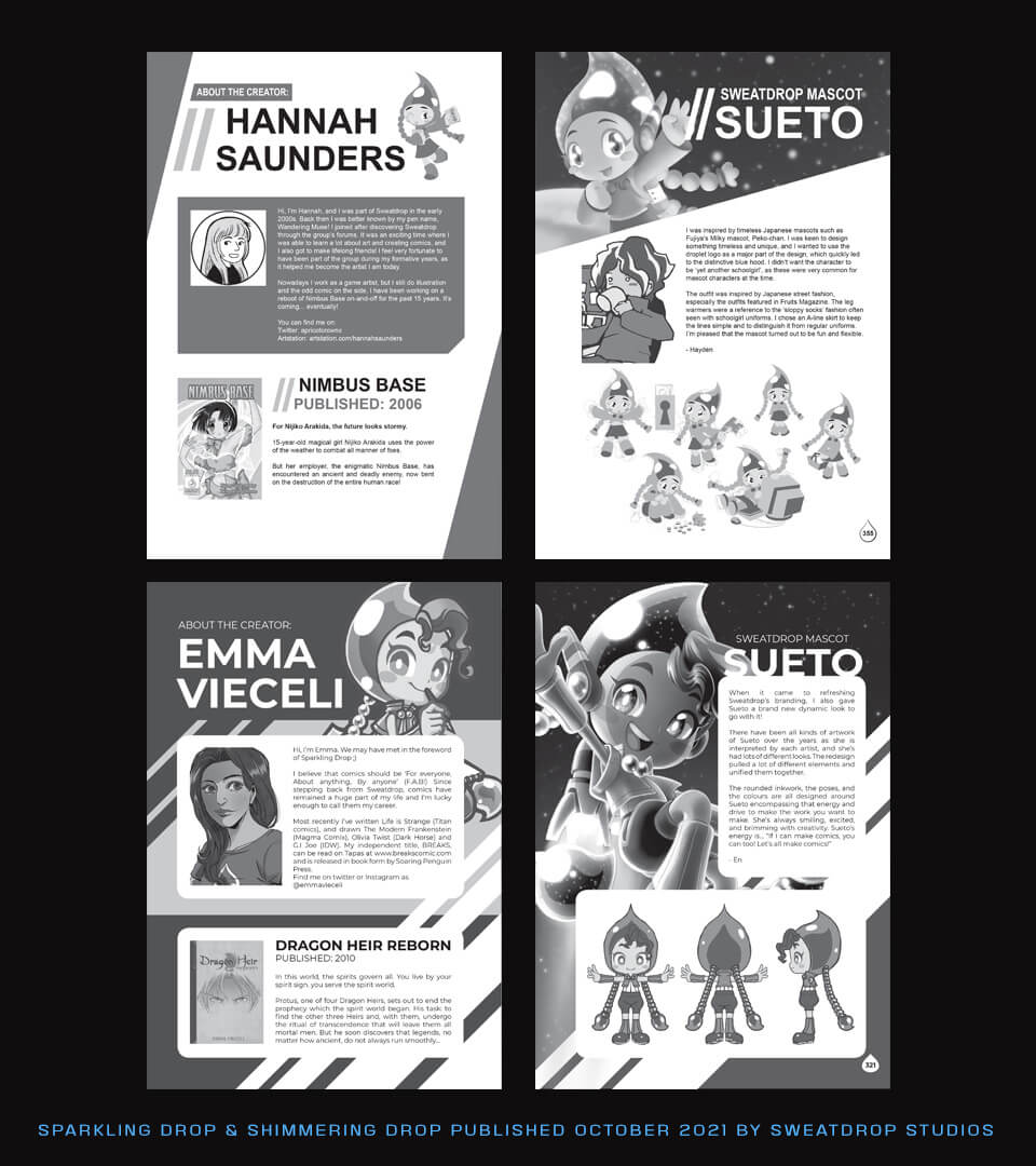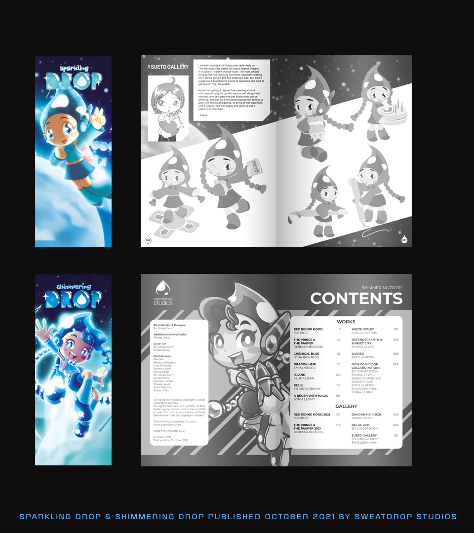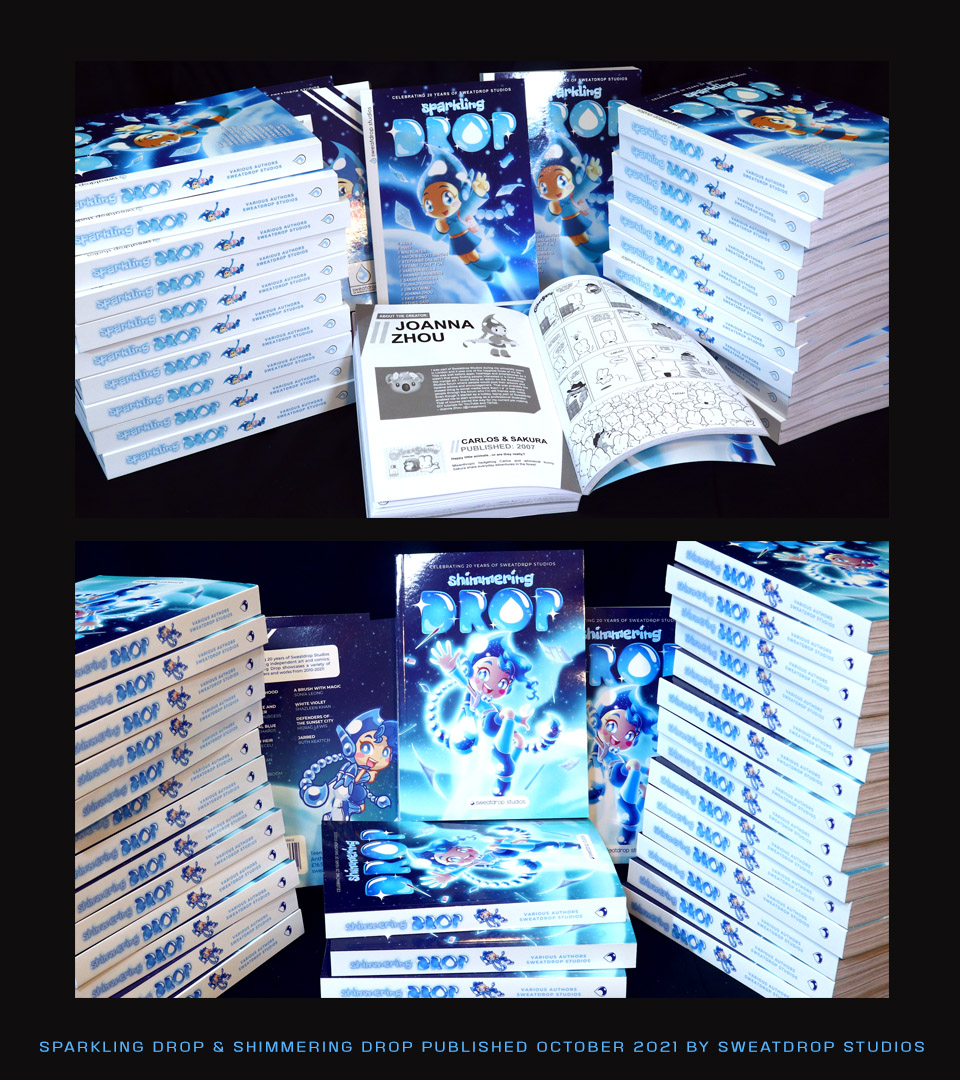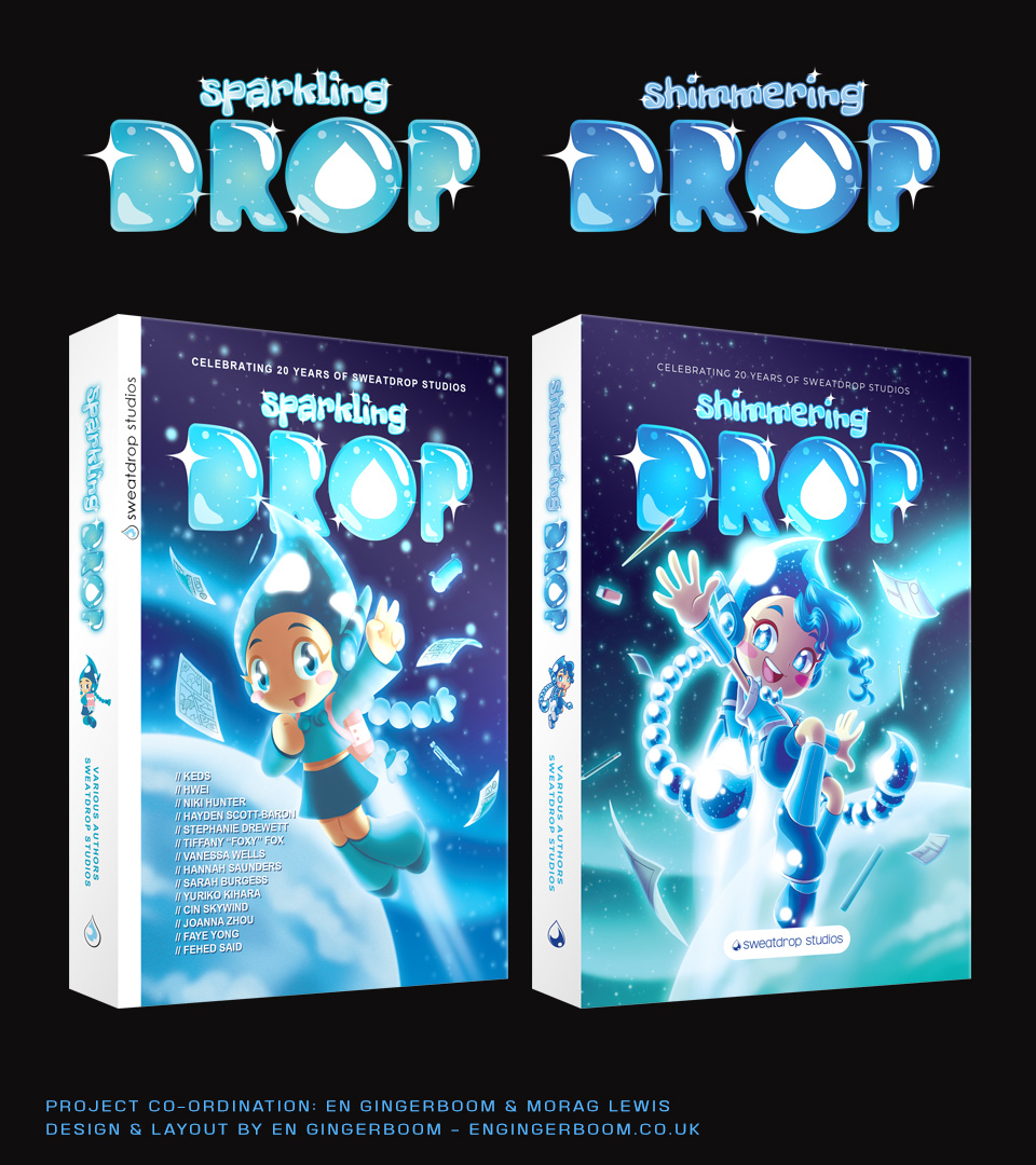 Project co-ordination, design, and layout on Sweatdrop Studio's monumental 20th anniversary anthologies, as well as marketing and promotional materials. Sparkling Drop covers the time period 2001-2009, and Shimmering Drop covers 2010-2021, and together total over 700 pages of work from over 20 different creators.