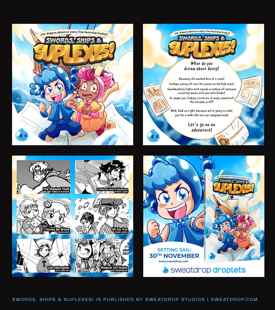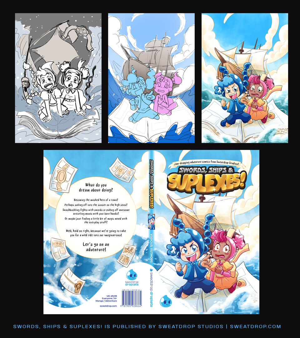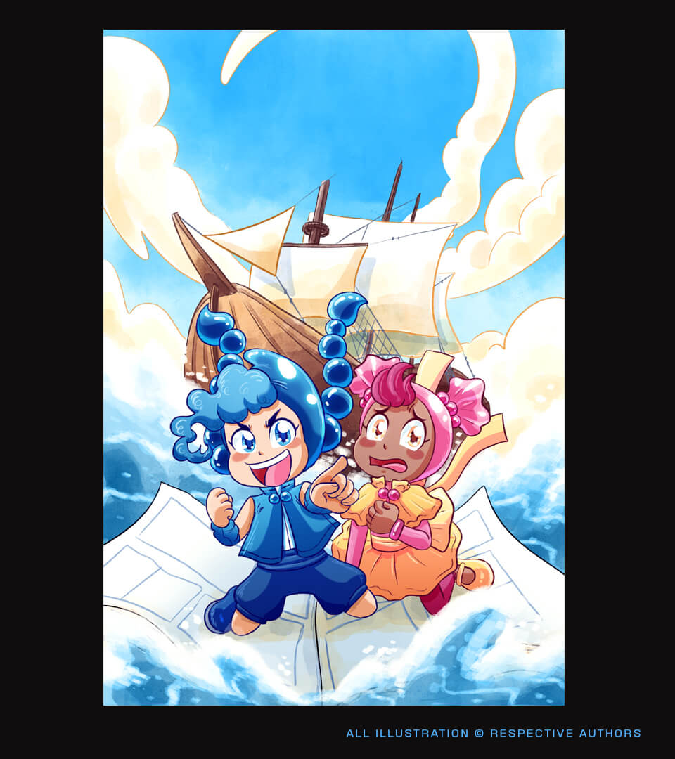 Coordination of a comic anthology for ages 6-12, art direction and design of the cover, logo/typography, and interior layouts.